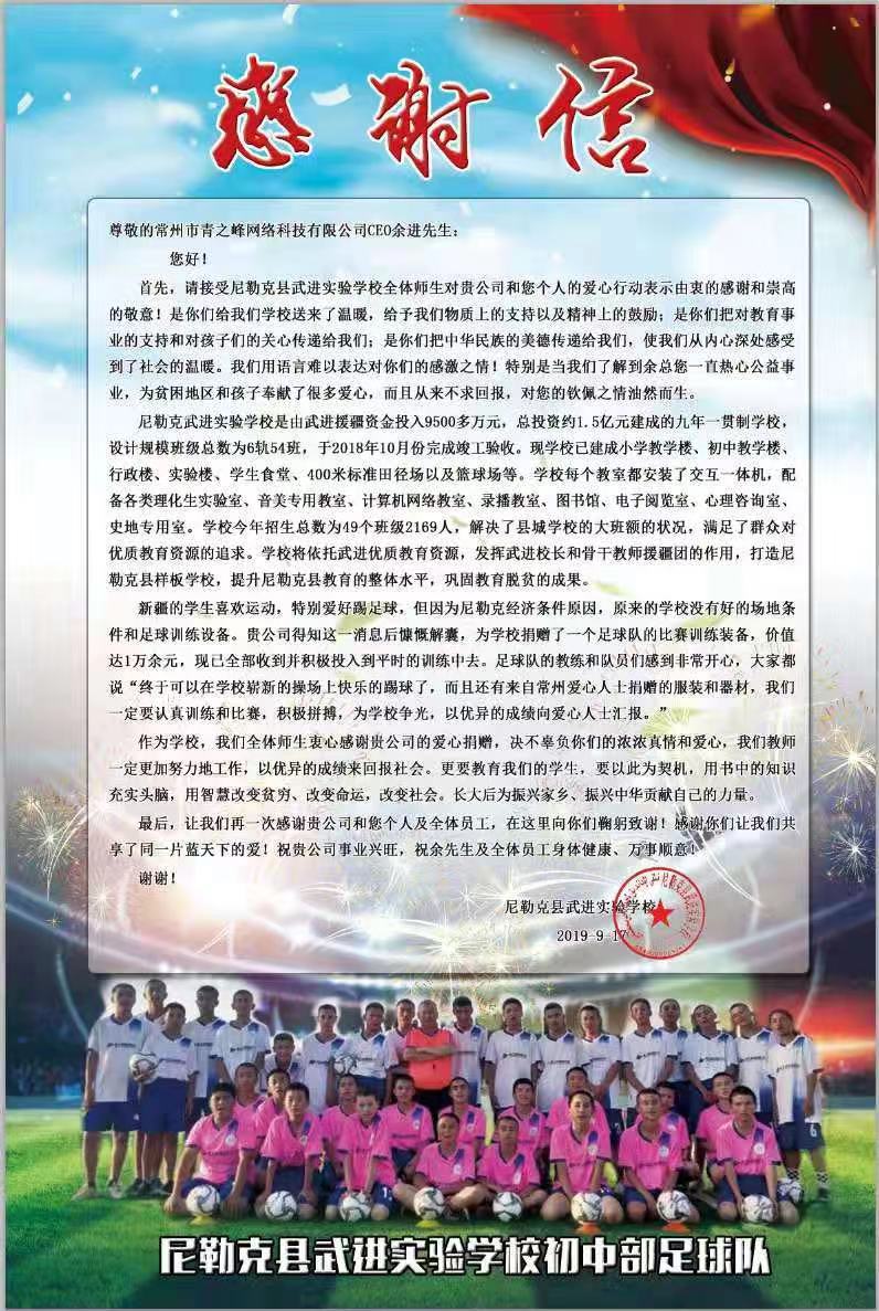 青峰集團(tuán)CEO余董在九月初了解到學(xué)校的學(xué)生們非常熱愛足球運(yùn)動(dòng),但是由于經(jīng)濟(jì)條件所限,沒能擁有健全的運(yùn)動(dòng)器材設(shè)施,于是代表青峰集團(tuán)螢火蟲愛心社,花費(fèi)11750元為尼勒克縣武進(jìn)實(shí)驗(yàn)學(xué)校的同學(xué)們購買了一個(gè)足球隊(duì)的比賽訓(xùn)練裝備,希望能夠讓同學(xué)們能夠擁有一個(gè)良好的學(xué)習(xí)、運(yùn)動(dòng)環(huán)境。